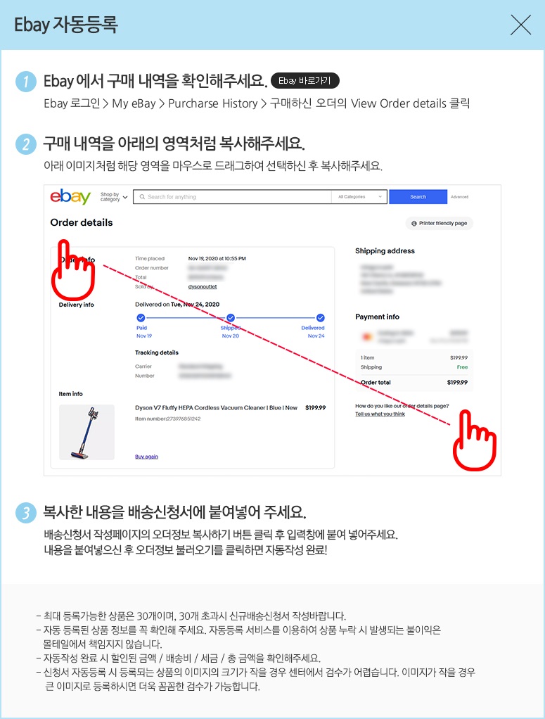 ebay의 경우 회원가입시 전화번호 중복등록이 불가능 하오니, 213으로 시작하는 임의의 번호를 넣고 등록하시기 바랍니다. (물품 구입 시, 배송지 설정란에서는 센터 연락처 정상 기입가능)