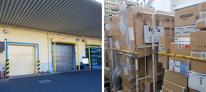 출고를 기다리고 있는 상품과 화물 출하시의 모습입니다.